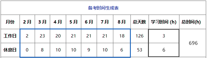 例如:從2月27日開始,接下來的每一天都學(xué)習(xí),工作日學(xué)習(xí)3小時,休息日學(xué)習(xí)6小時,那么在8月25日考試之前,共能學(xué)習(xí)696小時。