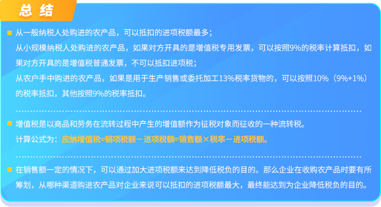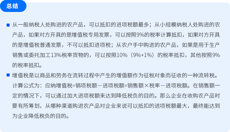 從一般納稅人處購(gòu)進(jìn)的農(nóng)產(chǎn)品,可以抵扣的進(jìn)項(xiàng)稅額最多;從小規(guī)模納稅人處購(gòu)進(jìn)的農(nóng)產(chǎn)品,如果對(duì)方開具的是增值稅專用發(fā)票,可以按照9%的稅率計(jì)算抵扣,如果對(duì)方開具的是增值稅普通發(fā)票,不可以抵扣進(jìn)項(xiàng)稅;從農(nóng)戶手中購(gòu)進(jìn)的農(nóng)產(chǎn)品,如果是用于生產(chǎn)銷售或委托加工13%稅率貨物的,可以按照10%(9%+1%)的稅率抵扣,其他按照9%的稅率抵扣。