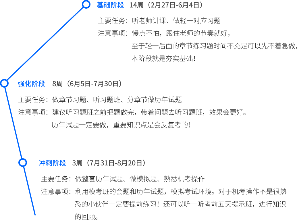 計劃表是以每天學(xué)習(xí)2-3小時為基礎(chǔ),如果是還沒有開始學(xué)習(xí)的考生,可以根據(jù)每章后面的時間來調(diào)整每天的學(xué)習(xí)時間,例如增加學(xué)習(xí)時間到每天3-4小時,以適應(yīng)從現(xiàn)在開始學(xué)習(xí)的學(xué)習(xí)計劃。那么,基礎(chǔ)階段、強化階段、沖刺階段的學(xué)習(xí)任務(wù)是什么?要怎么學(xué)?