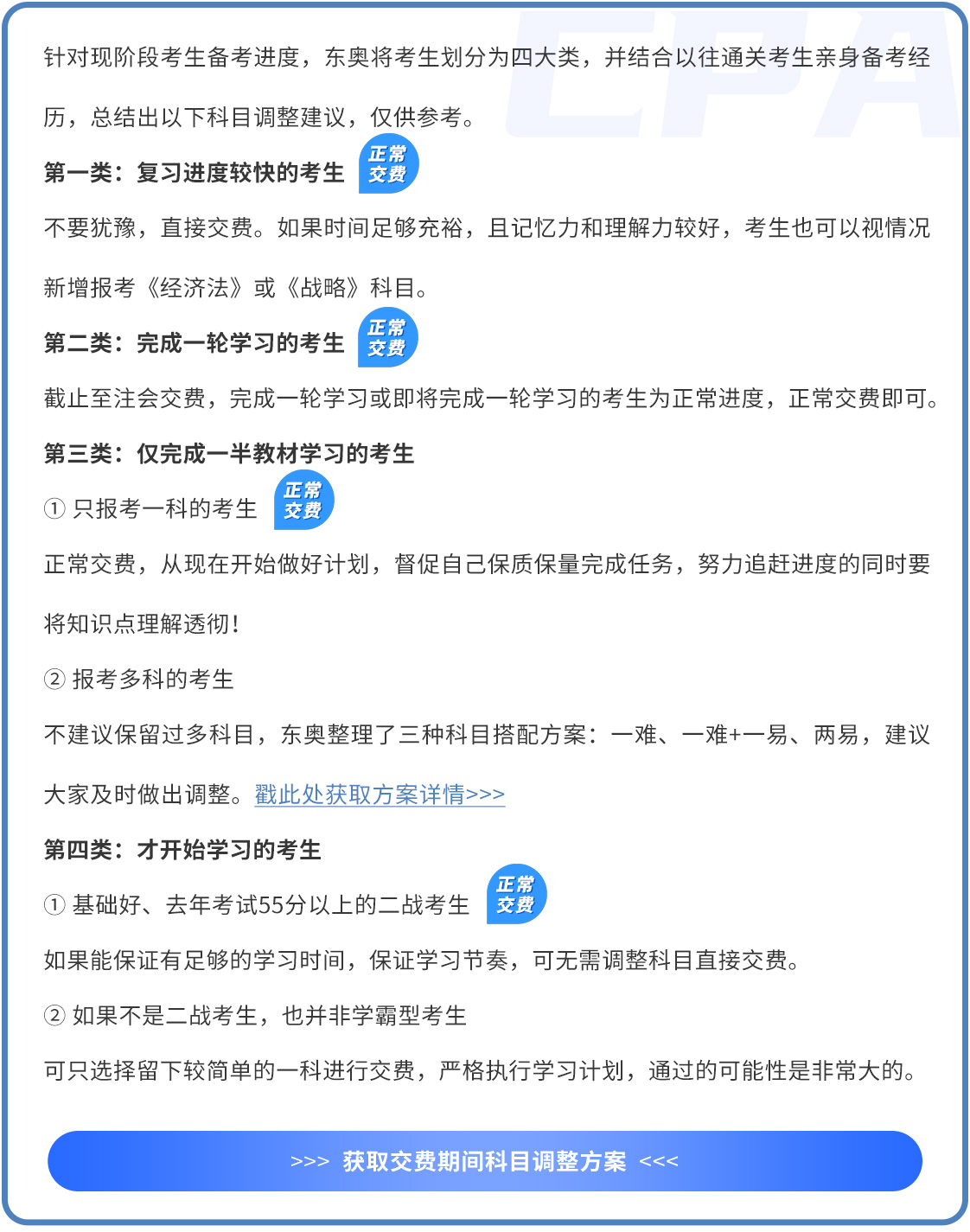 2023年注會(huì)交費(fèi)時(shí)間是6月15日-30日,由于本次交費(fèi)允許在考區(qū)不變的前提下對(duì)所報(bào)科目進(jìn)行調(diào)整,所以考生可根據(jù)自身備考進(jìn)度及學(xué)習(xí)效率增減報(bào)考科目。對(duì)此東奧結(jié)合以往通關(guān)考生的備考經(jīng)歷整理了交費(fèi)期科目調(diào)整建議,考生可參考建議重新搭配報(bào)考科目。同時(shí)考慮到現(xiàn)階段考生的備考進(jìn)度,本文還整理了學(xué)習(xí)干貨資料,有需要的考生趕快下載吧!點(diǎn)擊下方按鈕,可跳轉(zhuǎn)對(duì)應(yīng)內(nèi)容!