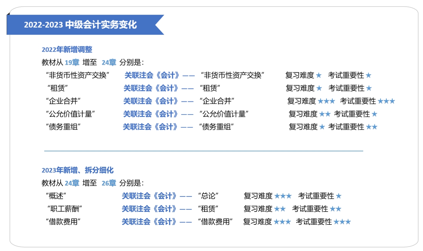 2022年的調(diào)整變化已經(jīng)有了“小型注會(huì)”的既視感。2023年則更像是要向注會(huì)的“細(xì)致考核”靠攏??傊?,當(dāng)初級(jí)、中級(jí)會(huì)計(jì)都在往注會(huì)程度提高時(shí),或許注會(huì)的知識(shí)內(nèi)容與知識(shí)結(jié)構(gòu)也會(huì)有所調(diào)整。