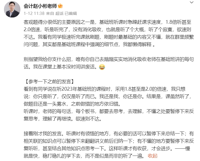 趙小彬老師為大家分析了客觀題得分低的原因,其中之一是在基礎階段學習時,有些考生可能由于急躁、追趕進度等因素,選擇1.8倍速甚至是2倍速聽課。正所謂欲速則不達,囫圇聽完基礎階段課程,不僅沒能消化吸收基礎知識點,還可能錯過強調的細節(jié)點,其負面影響在強化階段練習時就會顯現,這部分考生經常會被較為基礎的習題搞得一頭霧水。所以怎樣學習才是正確的?