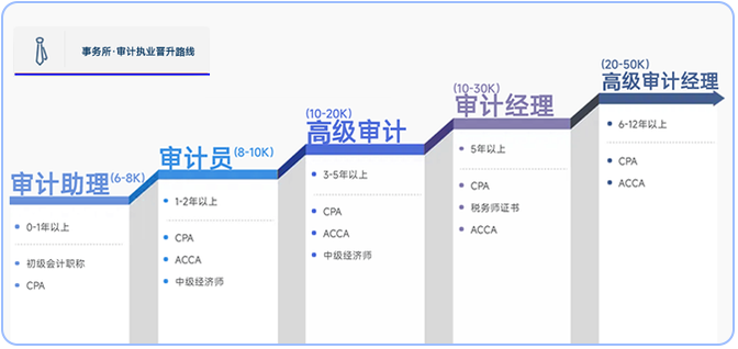 事務(wù)所中的晉升路線較為明晰,從審計(jì)助理到高級(jí)審計(jì)經(jīng)理,CPA證書與各個(gè)崗位深度掛鉤。想要在事務(wù)所中長(zhǎng)遠(yuǎn)發(fā)展,拿下注冊(cè)會(huì)計(jì)師證書并成為執(zhí)業(yè)注冊(cè)會(huì)計(jì)師是最優(yōu)選,這也是個(gè)人技能和經(jīng)驗(yàn)的有力證明。