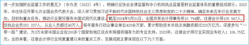 時隔三年,中國注冊會計師協(xié)會在2024年9月24日發(fā)布了《慶祝中華人民共和國成立75周年注冊會計師行業(yè)工作與發(fā)展成就掠影》,提到截至2024年5月31日,全國共有?注冊會計師105667人。??全國共有?會計師事務所10794家,?非執(zhí)業(yè)會員281237人,從業(yè)人員超過40萬人,2023年行業(yè)實現(xiàn)?業(yè)務收入1106.75億元。