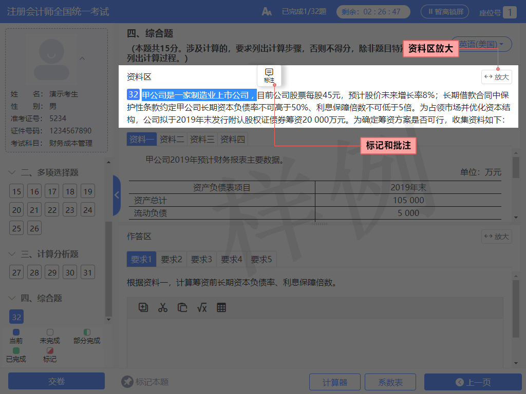 (7)考生對資料區(qū)使用標(biāo)注功能,不會被作為答題結(jié)果,也不會影響考生得分情況。
