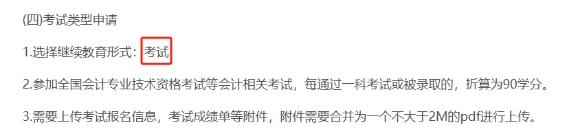 注會考生注意!申請過程中,系統(tǒng)要求選擇“考試”作為繼續(xù)教育形式。接著需要上傳相關(guān)證明文件,通常包括考試報名信息和成績單。所有文件需要合并為一個大小不超過2MB的PDF文檔。