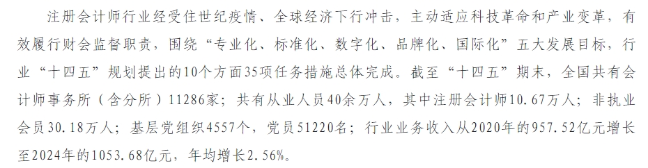 根據(jù)財(cái)政部及中注協(xié)的相關(guān)總結(jié),至“十四五”期末,注冊會(huì)計(jì)師行業(yè)經(jīng)受住了世紀(jì)疫情與全球經(jīng)濟(jì)下行的沖擊,行業(yè)業(yè)務(wù)收入從2020年的957.52億元增長至2024年的1053.68億元,全行業(yè)從業(yè)人員超過40萬人 。更重要的是,行業(yè)在“專業(yè)化、標(biāo)準(zhǔn)化、數(shù)字化、品牌化、國際化”方面取得了長足進(jìn)步。