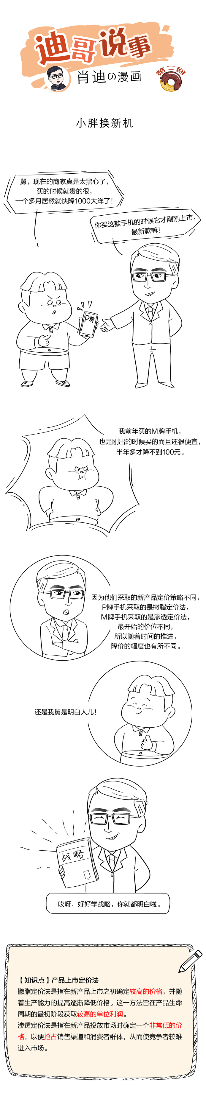 肖迪老師的外甥小胖買手機(jī)降價(jià)太快,僅1個(gè)月就降價(jià)1000大洋!小胖大呼不值!迪哥作為一個(gè)優(yōu)秀的注會戰(zhàn)略名師,巧妙的運(yùn)用了戰(zhàn)略知識改變了小胖的想法,兩人了解了產(chǎn)品定價(jià)策略。大家快來一起看看手機(jī)定價(jià)有什么“秘密”吧!注會名師迪哥說事第二回:小胖換新機(jī)