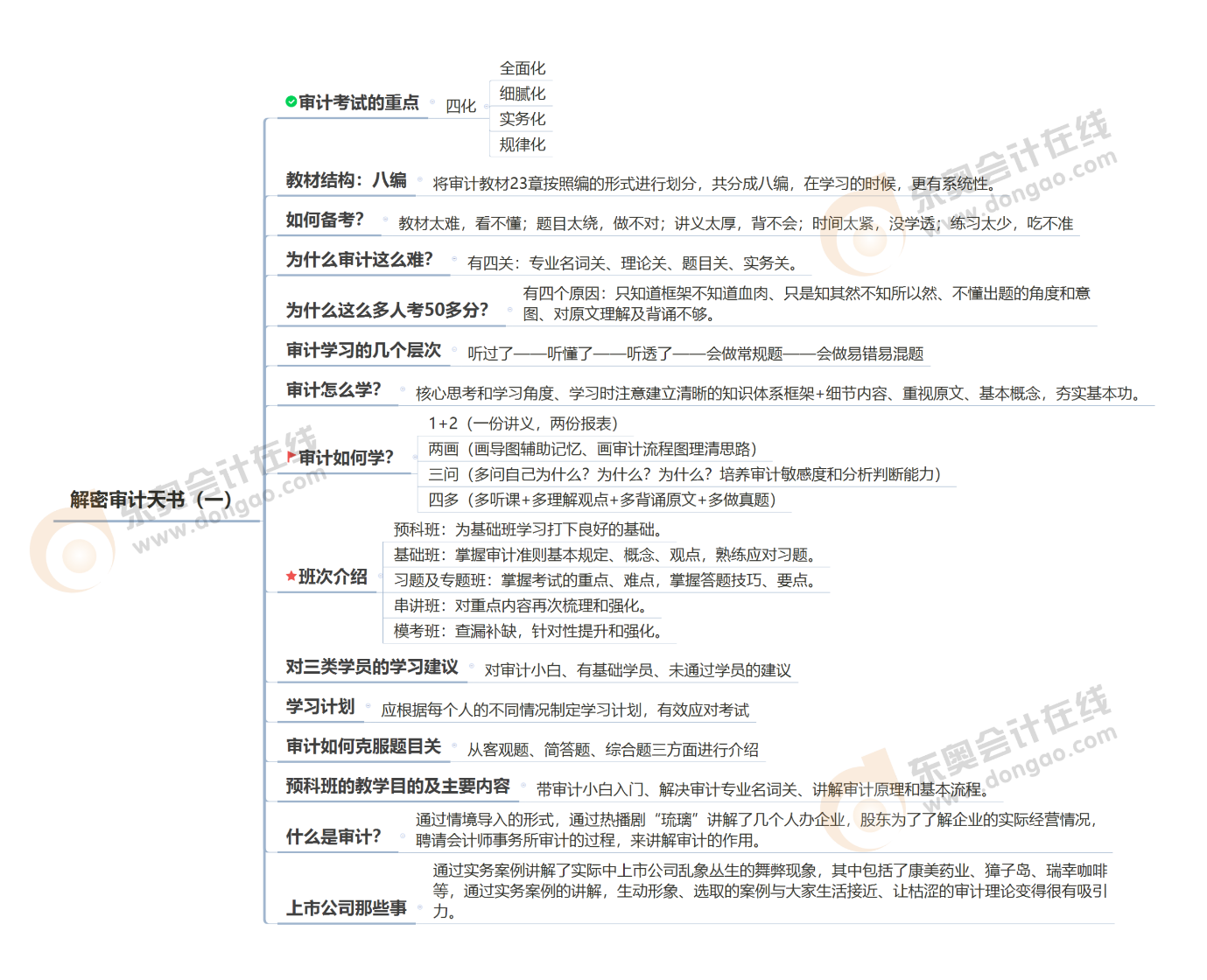 1+2(一份講義,兩份報(bào)表)、兩畫(畫導(dǎo)圖輔助記憶、畫審計(jì)流程圖理清思路)、四多(多聽課+多理解觀點(diǎn)+多背誦原文+多做真題)、三問(多問自己為什么?為什么?為什么?培養(yǎng)審計(jì)敏感度和分析判斷能力)。