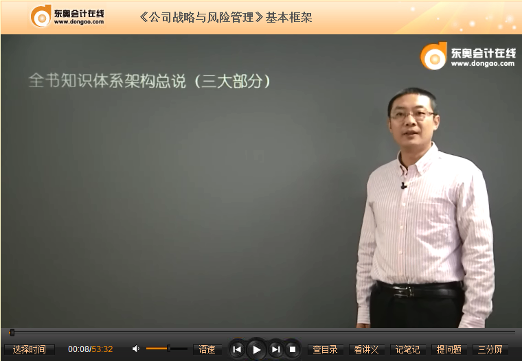 【東奧小編】2012年注冊會(huì)計(jì)師考試已順利結(jié)束,2013年注會(huì)考試開始新一輪復(fù)習(xí),東奧注會(huì)六門科目基礎(chǔ)班課程預(yù)計(jì)在新教材上市時(shí)開通,基礎(chǔ)班是最核心的課程,匯聚業(yè)界頂級(jí)名師,每位名師主講自己最擅長、把握最精準(zhǔn)的課程。讓考生一步一個(gè)腳印牢牢掌握每一個(gè)考點(diǎn)。以下是東奧名師呂鵬2013年注冊會(huì)計(jì)師考試免費(fèi)課件:《公司戰(zhàn)略與風(fēng)險(xiǎn)管理》基本框架講解: