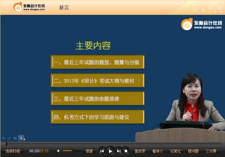 【東奧小編】2013年注冊(cè)會(huì)計(jì)師考試報(bào)名時(shí)間已截止,新一輪復(fù)習(xí)已拉開(kāi)序幕,東奧注會(huì)六門(mén)科目基礎(chǔ)班課程已開(kāi)通,目前已陸續(xù)更新,基礎(chǔ)班是最核心的課程,匯聚業(yè)界頂級(jí)名師,每位名師主講自己最擅長(zhǎng)、把握最精準(zhǔn)的課程。讓考生一步一個(gè)腳印牢牢掌握每一個(gè)考點(diǎn)。以下是東奧名師劉圣妮2013年注冊(cè)會(huì)計(jì)師考試基礎(chǔ)班免費(fèi)課件:《審計(jì)》之給初學(xué)審計(jì)的考生的一些建議。