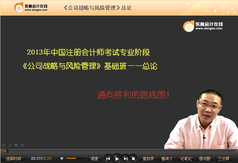 【東奧小編】2013年注冊(cè)會(huì)計(jì)師考試新一輪復(fù)習(xí)已拉開(kāi)序幕,東奧注會(huì)六門(mén)科目基礎(chǔ)班課程已開(kāi)通,目前已陸續(xù)更新,基礎(chǔ)班是最核心的課程,匯聚業(yè)界頂級(jí)名師,每位名師主講自己最擅長(zhǎng)、把握最精準(zhǔn)的課程。讓考生一步一個(gè)腳印牢牢掌握每一個(gè)考點(diǎn)。以下是東奧名師呂鵬2013年注冊(cè)會(huì)計(jì)師考試基礎(chǔ)班免費(fèi)課件:《公司戰(zhàn)略與風(fēng)險(xiǎn)管理》之總論。