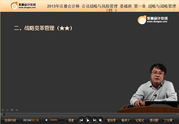 【東奧小編】2013年注冊會(huì)計(jì)師考試新一輪復(fù)習(xí)已拉開序幕,東奧注會(huì)六門科目基礎(chǔ)班課程已開通,目前已陸續(xù)更新,基礎(chǔ)班是最核心的課程,匯聚業(yè)界頂級名師,每位名師主講自己最擅長、把握最精準(zhǔn)的課程。讓考生一步一個(gè)腳印牢牢掌握每一個(gè)考點(diǎn)。以下是東奧名師田明2013年注冊會(huì)計(jì)師考試基礎(chǔ)班免費(fèi)課件:《公司戰(zhàn)略與風(fēng)險(xiǎn)管理》之戰(zhàn)略變革管理。