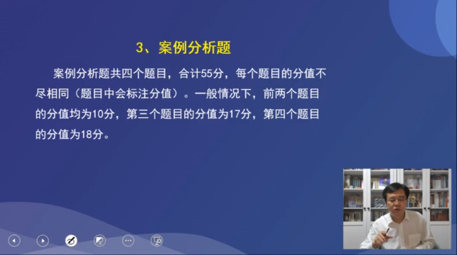 案例分析題共四個題目,合計55分,每個題目的分值不盡相同(題目中會標(biāo)注分值)。一般情況下,前兩個題目的分值均為10分,第三個題目的分值為17分,第四個題目的分值為18分。
