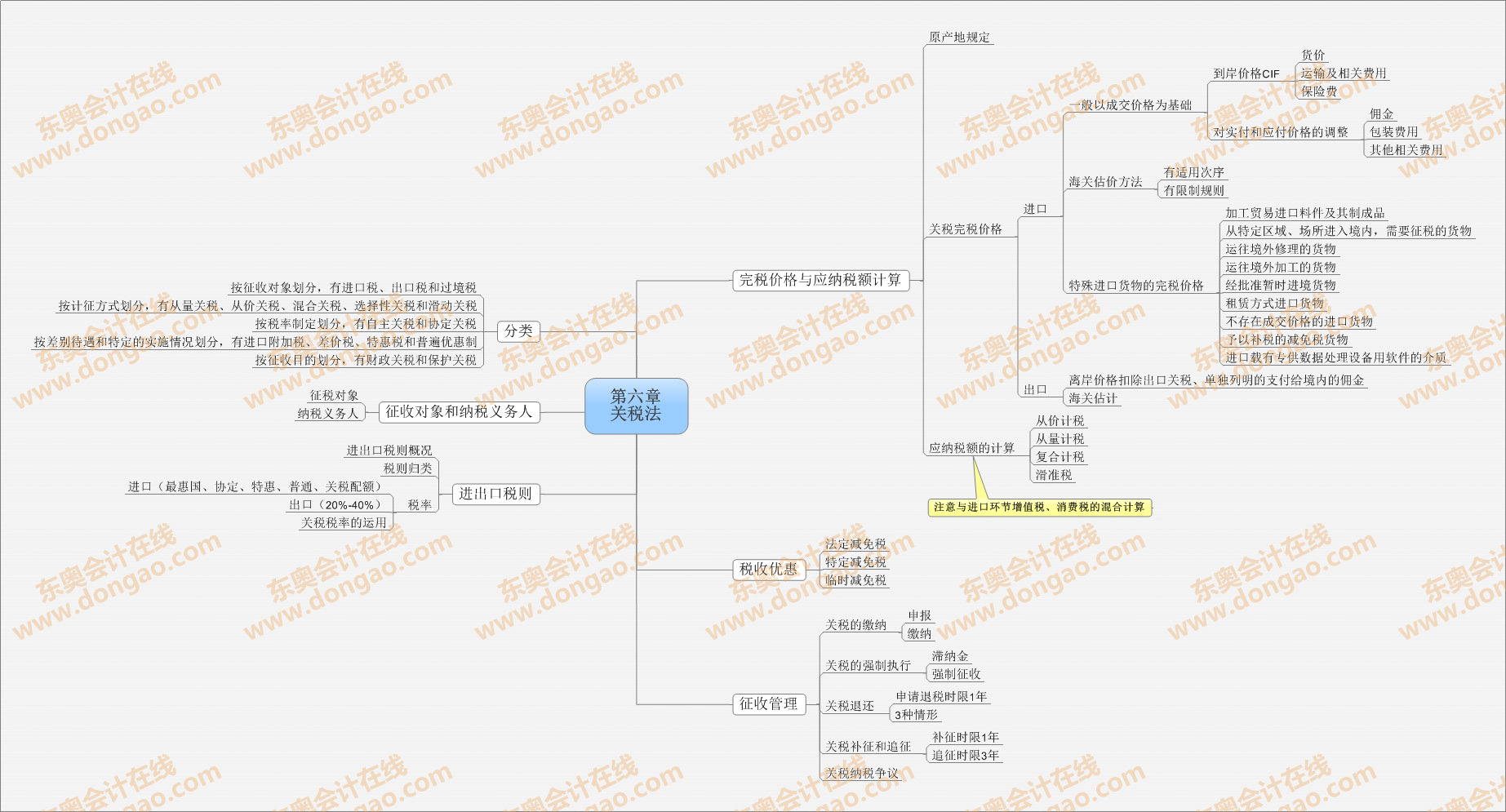 【東奧小編】2014年注冊會計師考試正式進入基礎(chǔ)備考階段,注會知識點繁雜細碎,想要全面掌握注會各科目的知識,需要科學高效的學習方法,思維導圖正是一種非常適合注會復習的學習方法,正確利用思維導圖,不僅能使自己積極進行知識點總結(jié),形成清晰的思路,還能對知識點進行快速查漏補缺。以下是2014《稅法》第六章關(guān)稅法的思維導圖: