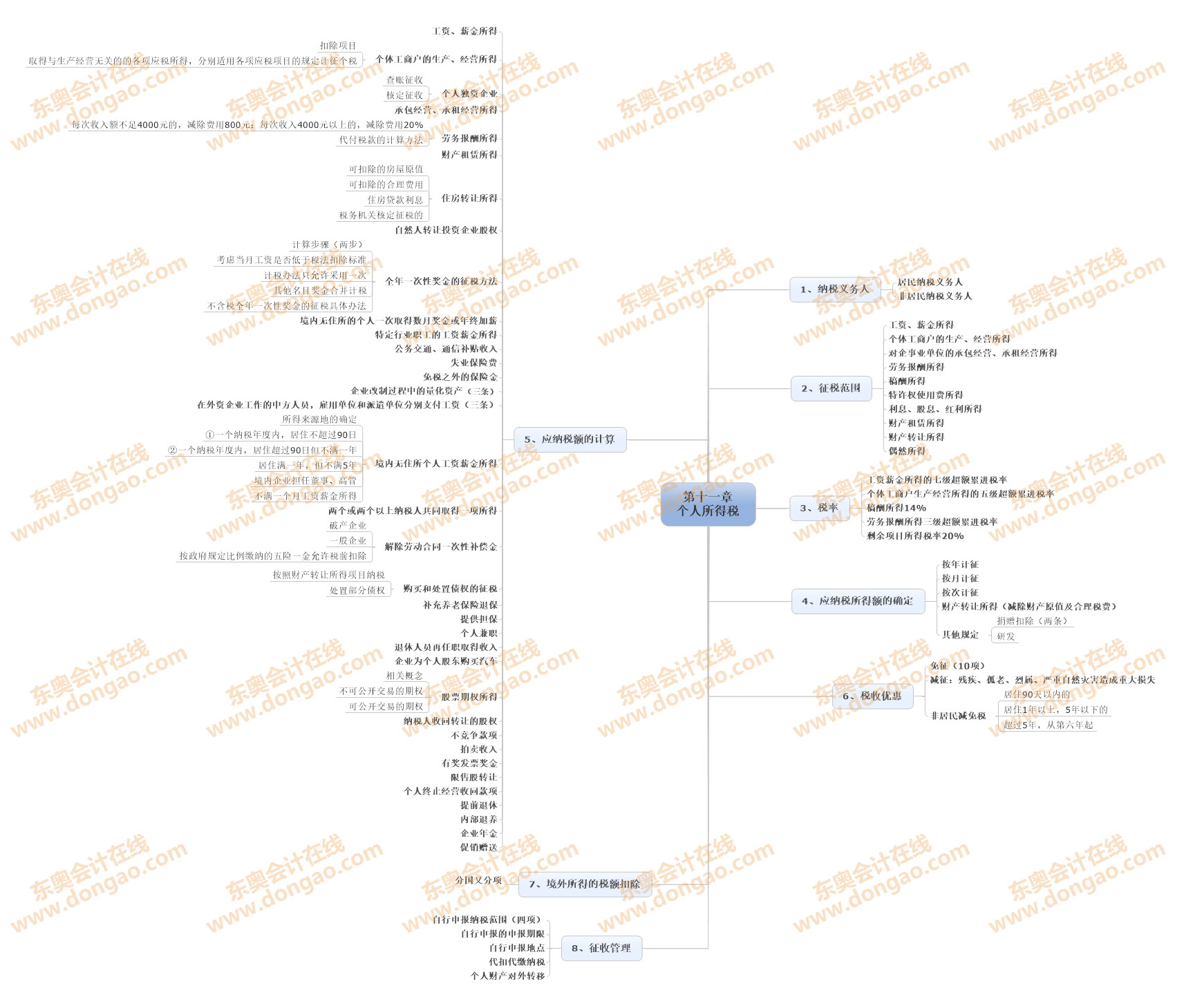 【東奧小編】2014年注冊會計師考試正式進入基礎(chǔ)備考階段,注會知識點繁雜細碎,想要全面掌握注會各科目的知識,需要科學(xué)高效的學(xué)習方法,思維導(dǎo)圖正是一種非常適合注會復(fù)習的學(xué)習方法,正確利用思維導(dǎo)圖,不僅能使自己積極進行知識點總結(jié),形成清晰的思路,還能對知識點進行快速查漏補缺。以下是2014《稅法》第十一章個人所得稅思維導(dǎo)圖: