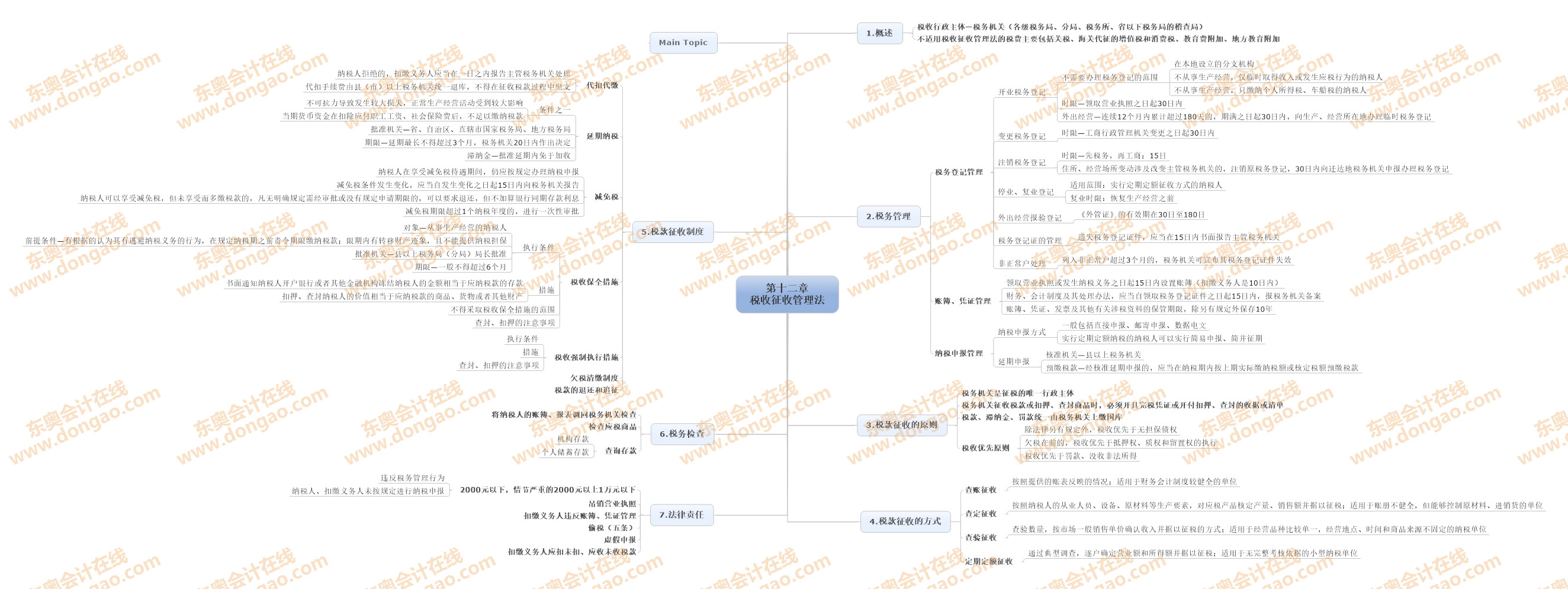 【東奧小編】2014年注冊(cè)會(huì)計(jì)師考試正式進(jìn)入基礎(chǔ)備考階段,注會(huì)知識(shí)點(diǎn)繁雜細(xì)碎,想要全面掌握注會(huì)各科目的知識(shí),需要科學(xué)高效的學(xué)習(xí)方法,思維導(dǎo)圖正是一種非常適合注會(huì)復(fù)習(xí)的學(xué)習(xí)方法,正確利用思維導(dǎo)圖,不僅能使自己積極進(jìn)行知識(shí)點(diǎn)總結(jié),形成清晰的思路,還能對(duì)知識(shí)點(diǎn)進(jìn)行快速查漏補(bǔ)缺。以下是2014《稅法》第十二章稅收征收管理法思維導(dǎo)圖: