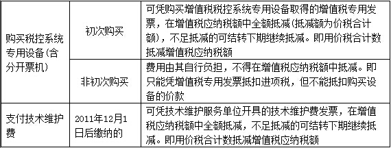 增值稅納稅人2011年12月1日(含,下同)以后初次購(gòu)買增值稅稅控系統(tǒng)專用設(shè)備(包括分開票機(jī))支付的費(fèi)用以及繳納的技術(shù)維護(hù)費(fèi),可在增值稅應(yīng)納稅額中全額抵減。具體規(guī)定如下表: