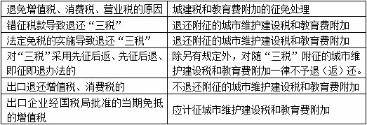 (2)對(duì)因減免稅而需進(jìn)行“三稅”退庫(kù)的,城建稅也同時(shí)退庫(kù)。但是對(duì)出口產(chǎn)品退還增值稅、消費(fèi)稅的,不退還已繳納的城建稅;對(duì)“三稅”實(shí)行先征后返、先征后退、即征即退辦法的,除另有規(guī)定外,對(duì)隨“三稅”附征的城市維護(hù)建設(shè)稅和教育費(fèi)附加,一律不予退(返)還。