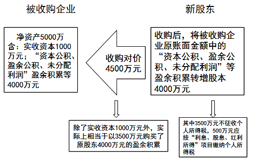 (2)新股東以低于凈資產(chǎn)價格收購股權(quán)的,企業(yè)原盈余積累中,對于股權(quán)收購價格減去原股本的差額部分已經(jīng)計入股權(quán)交易價格,新股東取得盈余積累轉(zhuǎn)增股本的部分,不征收個人所得稅;對于股權(quán)收購價格低于原所有者權(quán)益的差額部分未計入股權(quán)交易價格,新股東取得盈余積累轉(zhuǎn)增股本的部分,應(yīng)按照“利息、股息、紅利所得”項目征收個人所得稅。