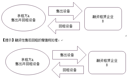 (1)融資性售后回租。是指承租方以融資為目的,將資產(chǎn)出售給從事融資租賃業(yè)務的企業(yè)后,又將該資產(chǎn)租回的業(yè)務活動。承租方先將資產(chǎn)銷售取得資金,再支付資金將已售資產(chǎn)租回使用,其實質(zhì)屬于融資行為。