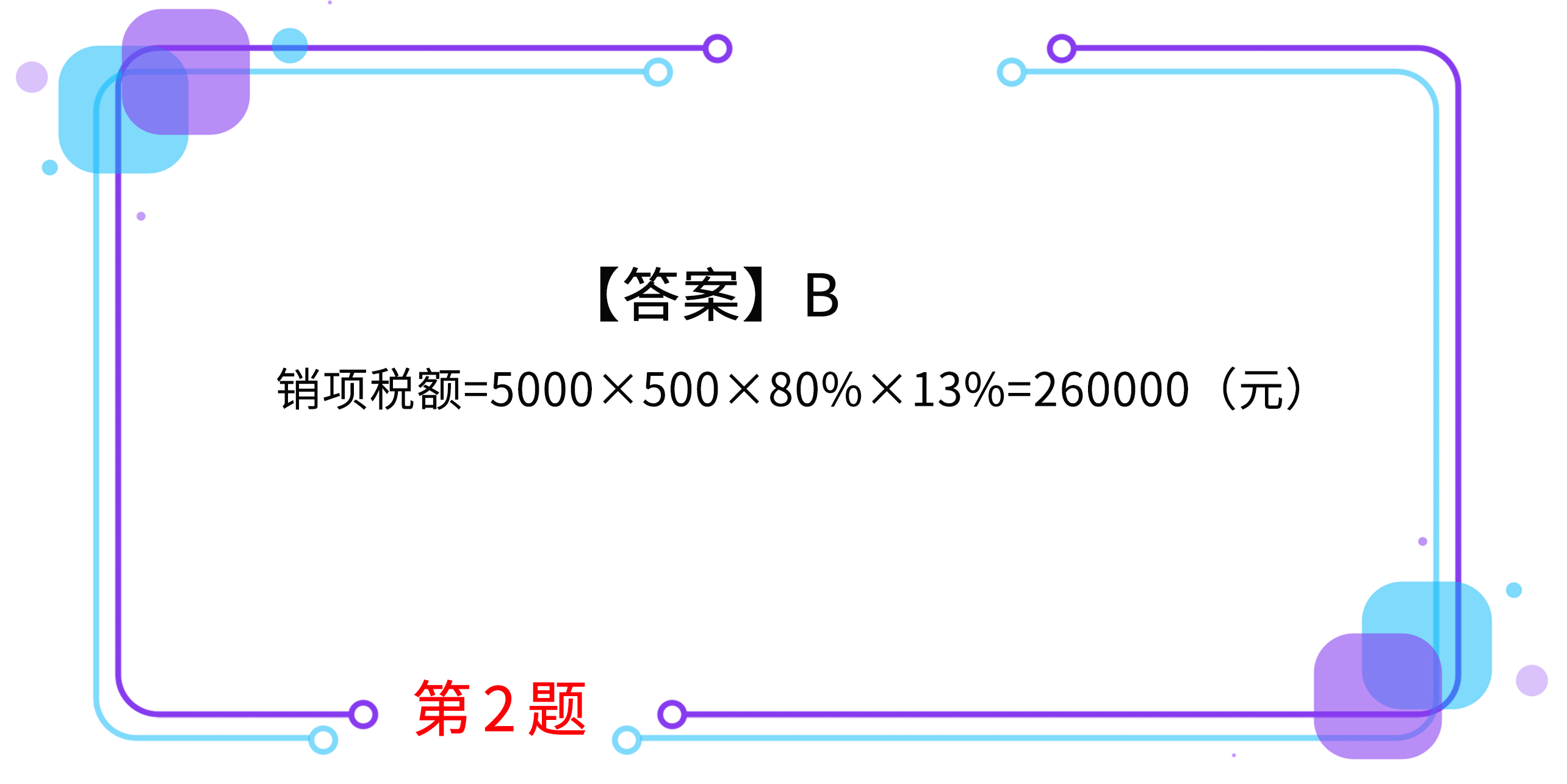 2.甲企業(yè)(一般納稅人)銷售給乙公司5000套服裝,每套不含稅價(jià)格為500元,由于乙公司購(gòu)買數(shù)量多,甲企業(yè)按原價(jià)的8折優(yōu)惠銷售(折扣額與銷售額在同一張發(fā)票的金額欄中分別注明)。乙公司于10日付款,則甲企業(yè)此項(xiàng)業(yè)務(wù)的銷項(xiàng)稅額為(     )。