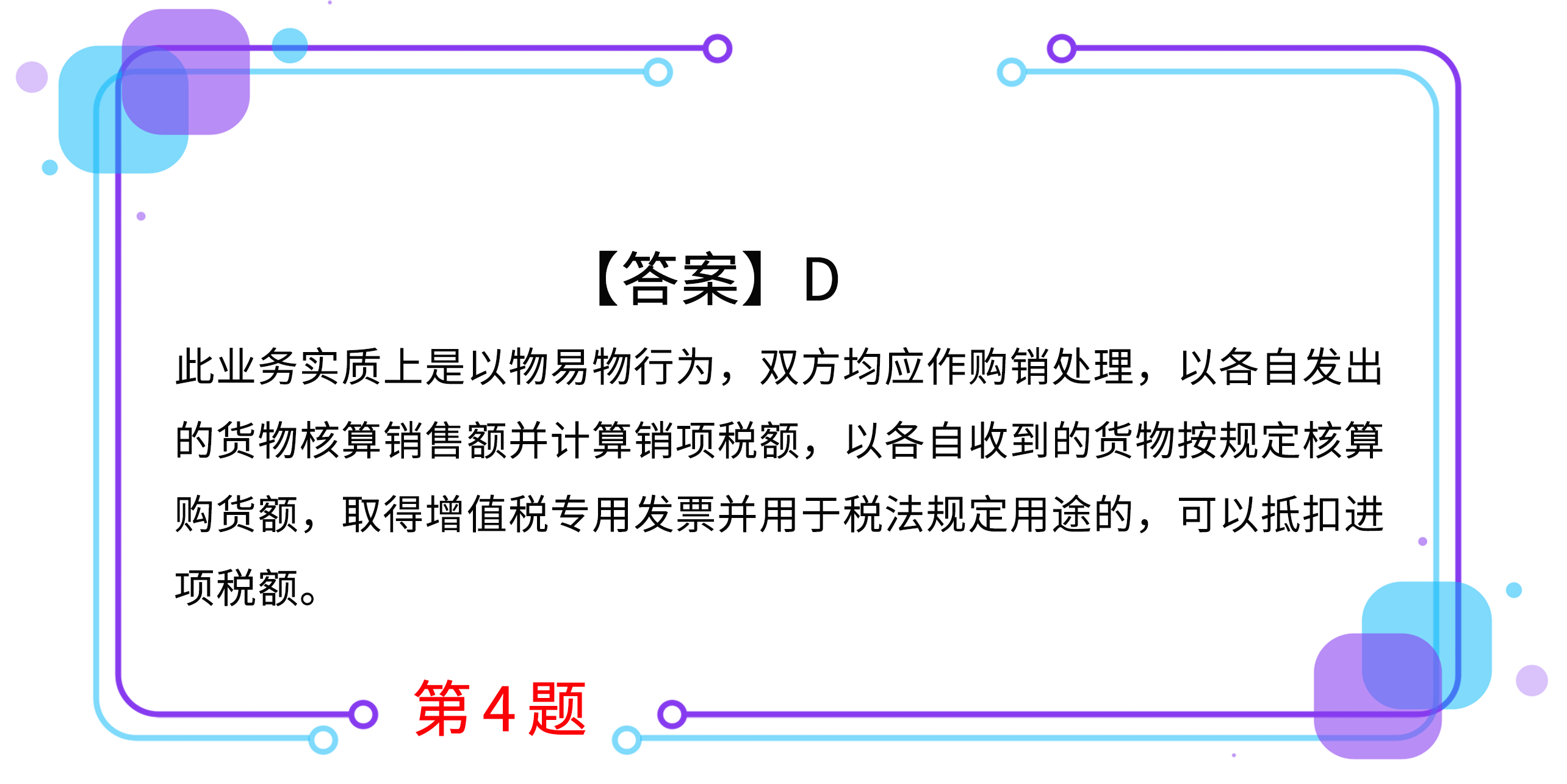 D.甲、乙雙方都應(yīng)作購(gòu)銷處理,可互開增值稅專用發(fā)票,分別核算銷售額和購(gòu)進(jìn)額,分別計(jì)算銷項(xiàng)稅額和進(jìn)項(xiàng)稅額