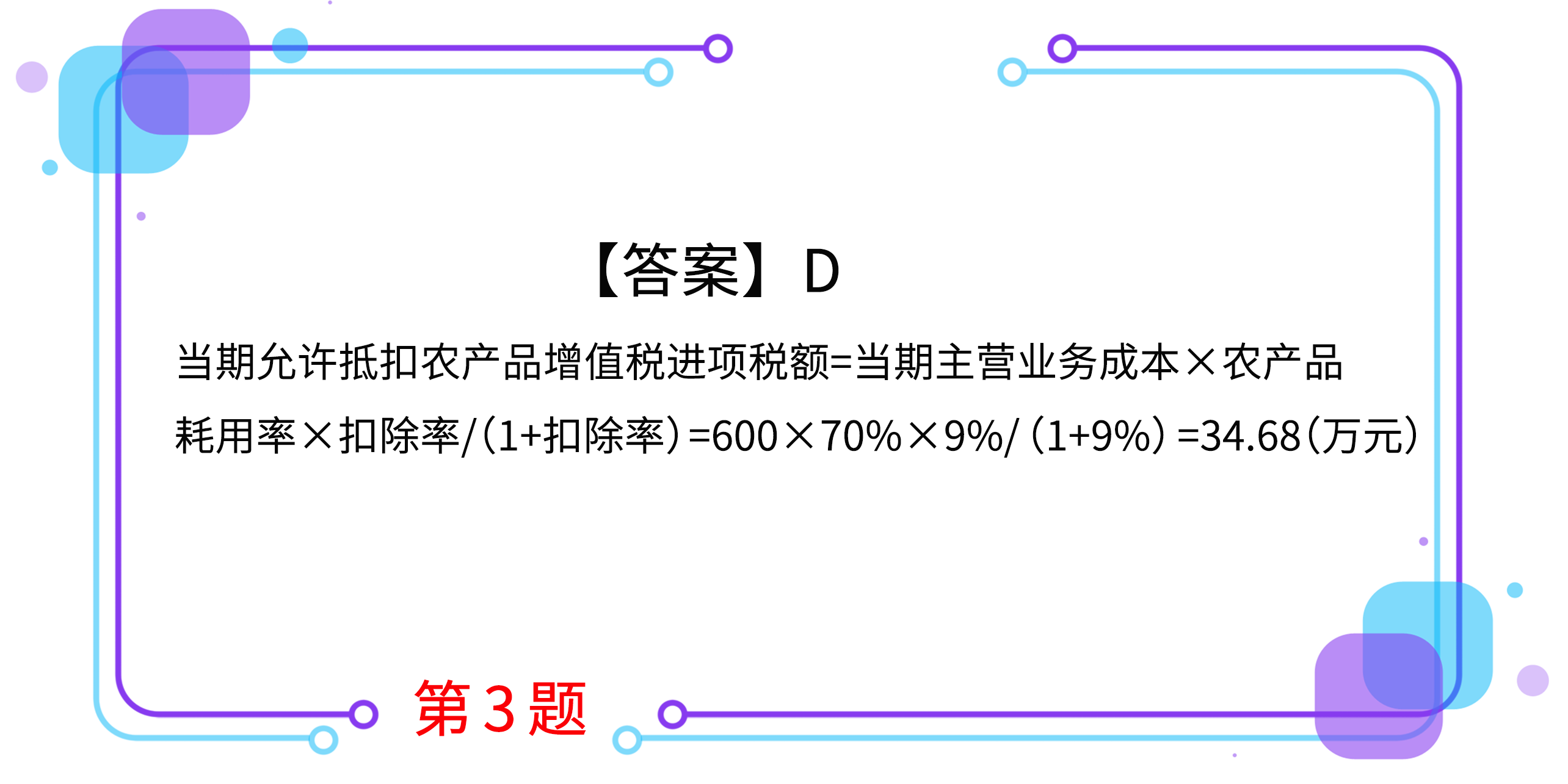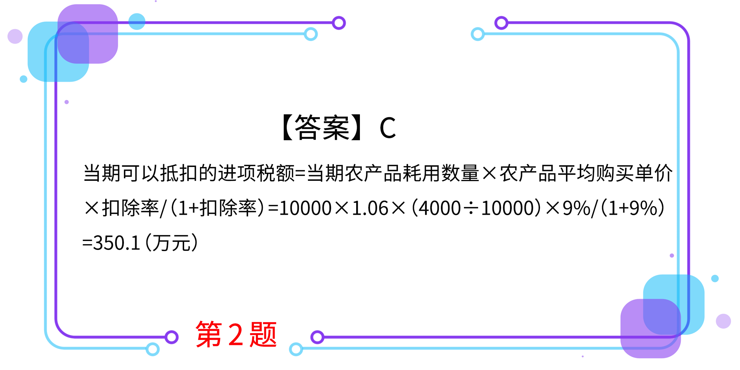 2.某公司為增值稅一般納稅人,其農(nóng)產(chǎn)品實(shí)行增值稅進(jìn)項(xiàng)稅額核定扣除辦法,2019年12月1日~12月31日銷(xiāo)售10000噸巴氏殺菌乳,原乳單耗數(shù)量為1.06噸,原乳平均購(gòu)買(mǎi)單價(jià)為4000元/噸。在采用投入產(chǎn)出法的情況下,當(dāng)期可以抵扣的進(jìn)項(xiàng)稅額是(      )萬(wàn)元。