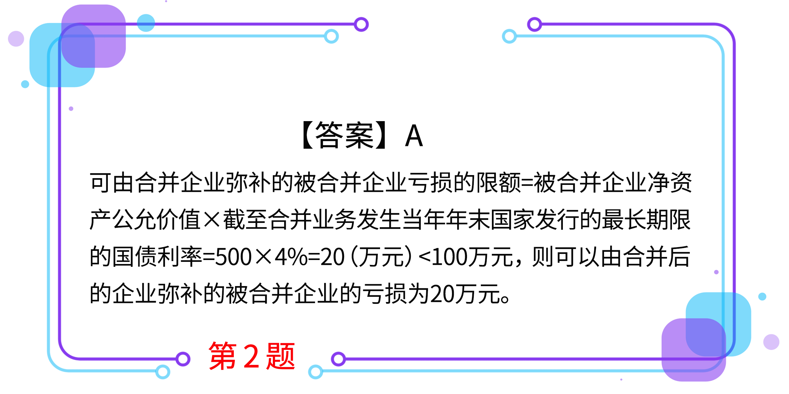 2.A企業(yè)合并B企業(yè),B企業(yè)尚在彌補期的未彌補的虧損為100萬元,凈資產公允價值為500萬元。A企業(yè)凈資產公允價值為1500萬元,截至合并業(yè)務發(fā)生當年年末國家發(fā)行的最長期限的國債利率為4%,假定該業(yè)務適用特殊性稅務處理的方式,則可以由合并后的企業(yè)彌補的被合并企業(yè)的虧損為(      )萬元。