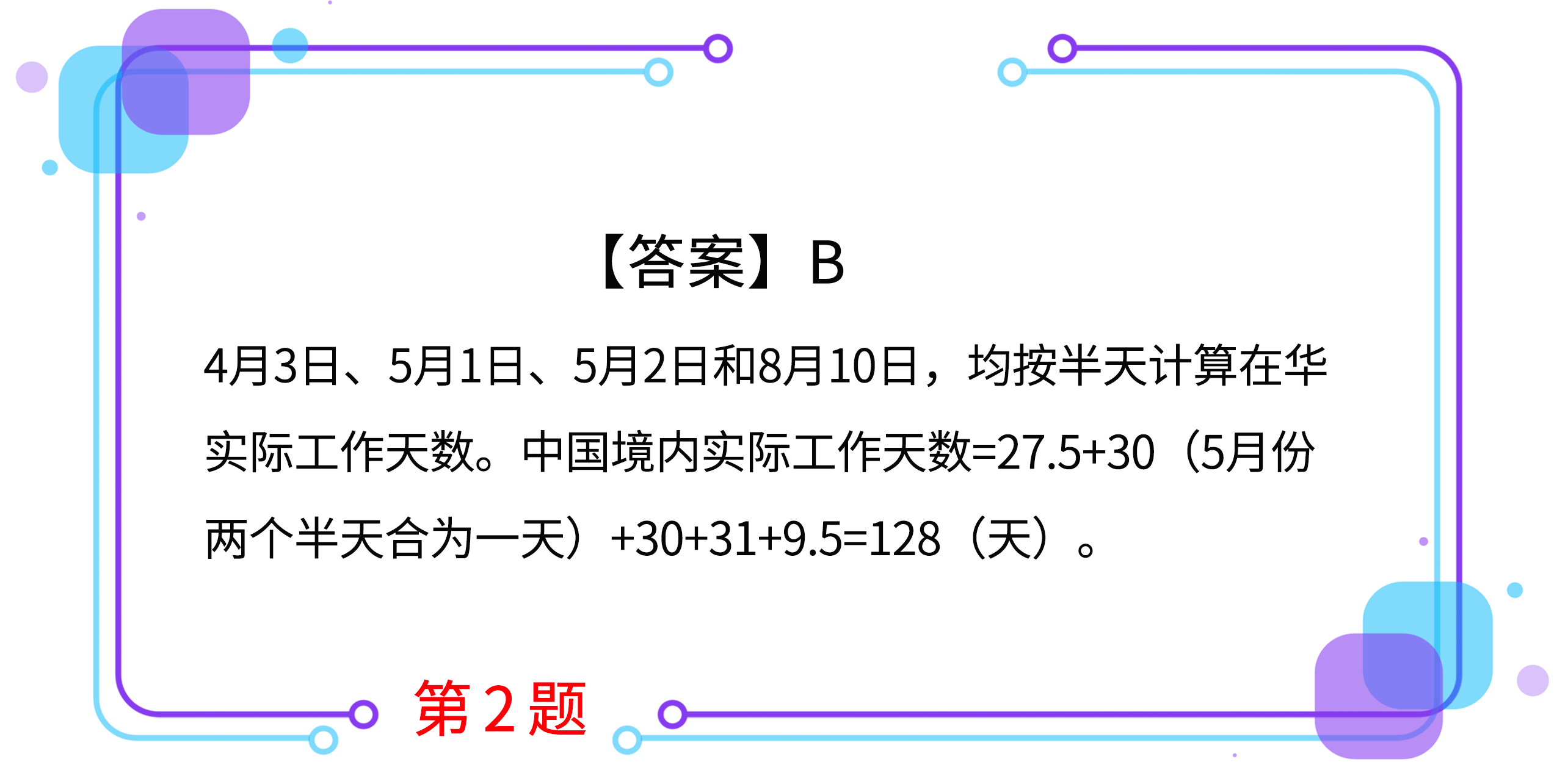 2.約翰為外籍個(gè)人,在中國境內(nèi)無住所,同時(shí)在中國境內(nèi)W公司擔(dān)任高管,2019年4月3日來華,8月10日離開。期間約翰因工作原因,曾于5月1日離境,5月2日返回。在計(jì)算個(gè)人所得稅時(shí),他在中國境內(nèi)實(shí)際工作天數(shù)為(  )天。