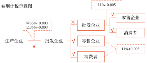 1.復合計稅——卷煙批發(fā)環(huán)節(jié)的稅率為11%的比例稅率加0.005元/支的定額稅率;
