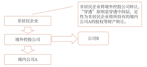 簡(jiǎn)而言之,就是通過“穿透”原則,稅務(wù)機(jī)關(guān)將非居民企業(yè)不具有合理商業(yè)目的的間接轉(zhuǎn)讓交易定性為直接轉(zhuǎn)讓交易,從而確保我國(guó)稅基不受侵蝕。適用于被轉(zhuǎn)讓的境外企業(yè)在華擁有特定應(yīng)稅財(cái)產(chǎn)(在華設(shè)立機(jī)構(gòu)場(chǎng)所、在華擁有不動(dòng)產(chǎn)或不動(dòng)產(chǎn)公司、在華擁有權(quán)益性投資資產(chǎn))的情況,不適用于股權(quán)轉(zhuǎn)讓所得與股權(quán)轉(zhuǎn)讓方在中國(guó)境內(nèi)所設(shè)機(jī)構(gòu)、場(chǎng)所有實(shí)際聯(lián)系的情況。