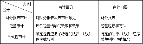 注冊會計師審計是一種有償?shù)奈袑徲,按照接受委托目的和內容,注冊會計師審計可分為財務報表審計、?jīng)營審計和合規(guī)性審計,三者的區(qū)別見下表: