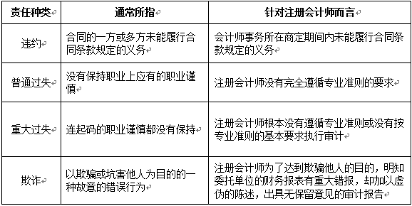 對(duì)注冊(cè)會(huì)計(jì)師法律責(zé)任可能被認(rèn)定為違約、過(guò)失和欺詐,其中,過(guò)失可按程度不同區(qū)分為普通過(guò)失和重大過(guò)失。如下表所示: