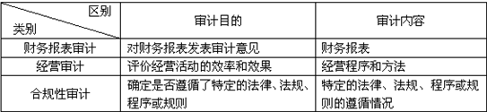 注冊會計師審計是一種有償?shù)奈袑徲嫞凑战邮芪心康暮蛢?nèi)容,注冊會計師審計可分為財務(wù)報表審計、經(jīng)營審計和合規(guī)性審計,三者的區(qū)別見下表1-2。