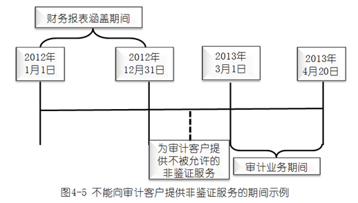2.如果在財務(wù)報表涵蓋的期間之后,在審計項目組開始執(zhí)行審計業(yè)務(wù)之前,會計師事務(wù)所向?qū)徲嬁蛻籼峁┝朔氰b證服務(wù),并且該非鑒證服務(wù)在審計期間不允許提供,會計師事務(wù)所應(yīng)當(dāng)評價提供的非鑒證服務(wù)對獨立性產(chǎn)生的不利影響。