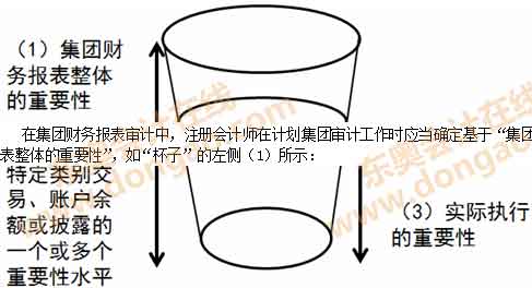 在集團財務(wù)報表審計中,注冊會計師在計劃集團審計工作時應(yīng)當確定基于“集團財務(wù)報表整體的重要性”,如“杯子”的左側(cè)(1)所示: