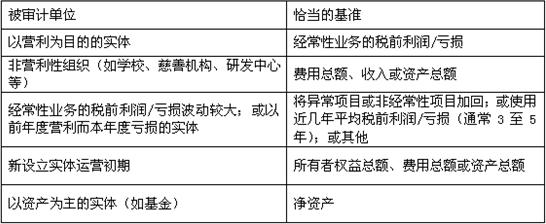 適當(dāng)?shù)幕鶞?zhǔn)取決于被審計(jì)單位的具體情況,下表列示了不同性質(zhì)的被審計(jì)單位及其恰當(dāng)?shù)幕鶞?zhǔn):