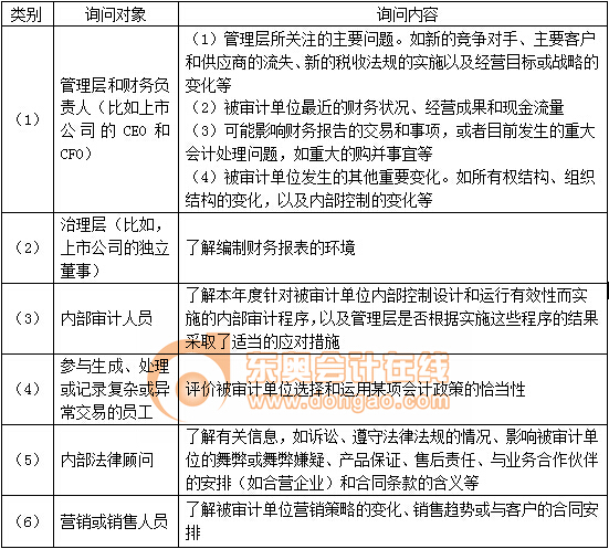 詢問管理層和被審計單位內(nèi)部其他人員是注冊會計師了解被審計單位及其環(huán)境的一個重要信息來源。