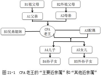 下面我們以ABC會計師事務(wù)所審計項目組成員CPA“老王”為例,結(jié)合注冊會計師實務(wù)操作,把CPA“老王”的“近親屬”分為主要近親屬(用A表示)和其他近親屬(用B表示),如圖21-1所示: