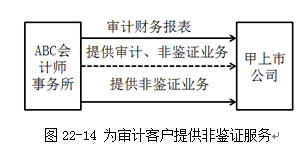 會計師事務(wù)所為審計客戶提供非鑒證服務(wù),可能對獨立性產(chǎn)生不利影響,包括因自我評價、自身利益和過度推介等產(chǎn)生的不利影響。如圖22-14所示: