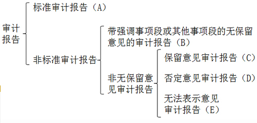 【提示】某會(huì)計(jì)師事務(wù)所對(duì)某上市公司某年度財(cái)務(wù)報(bào)表出具的“審計(jì)報(bào)告類(lèi)型”只能是上圖中的某一種,或(A)、或(B)、或(C)、或(D)、或(E)。