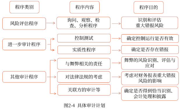 如圖2-4所示,具體審計計劃包括風險評估程序、計劃實施的進一步審計程序和其他審計程序。
