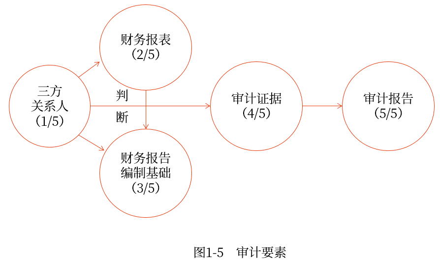 在財(cái)務(wù)報(bào)表審計(jì)中,審計(jì)要素包括審計(jì)業(yè)務(wù)的三方關(guān)系人(1/5)、財(cái)務(wù)報(bào)表(2/5)、財(cái)務(wù)報(bào)告編制基礎(chǔ)(3/5)、審計(jì)證據(jù)(4/5)和審計(jì)報(bào)告(5/5)。