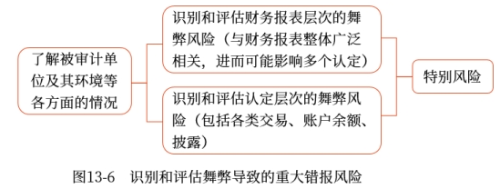 在識別和評估財(cái)務(wù)報(bào)表層次以及各類交易、賬戶余額、披露的認(rèn)定層次的重大錯報(bào)風(fēng)險(xiǎn)時,注冊會計(jì)師應(yīng)當(dāng)識別和評估舞弊導(dǎo)致的重大錯報(bào)風(fēng)險(xiǎn),如圖13-6所示。