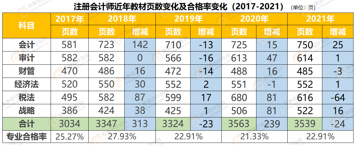 為了驗(yàn)證這種觀點(diǎn)是否正確,我們對官方公布的近年教材頁數(shù)增加和注冊會計師考試專業(yè)階段合格率綜合分析,制作出以下表格。