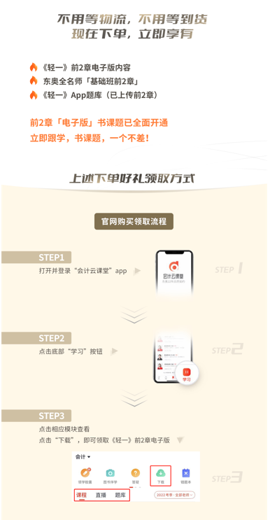 現(xiàn)在下單注會《輕松過關(guān)?1》系列圖書,會跟隨訂單贈送電子版教材及試題,電子版學(xué)習(xí)資料按照學(xué)習(xí)進度上傳,確??忌谝咔槠陂g備考“不掉隊”;物流恢復(fù)正常后,東奧保證疫情和物流管控地區(qū)的學(xué)員將會第一時間收到實體書《輕一》,還會隨書郵寄贈送一部分相關(guān)視頻課程及試題哦!