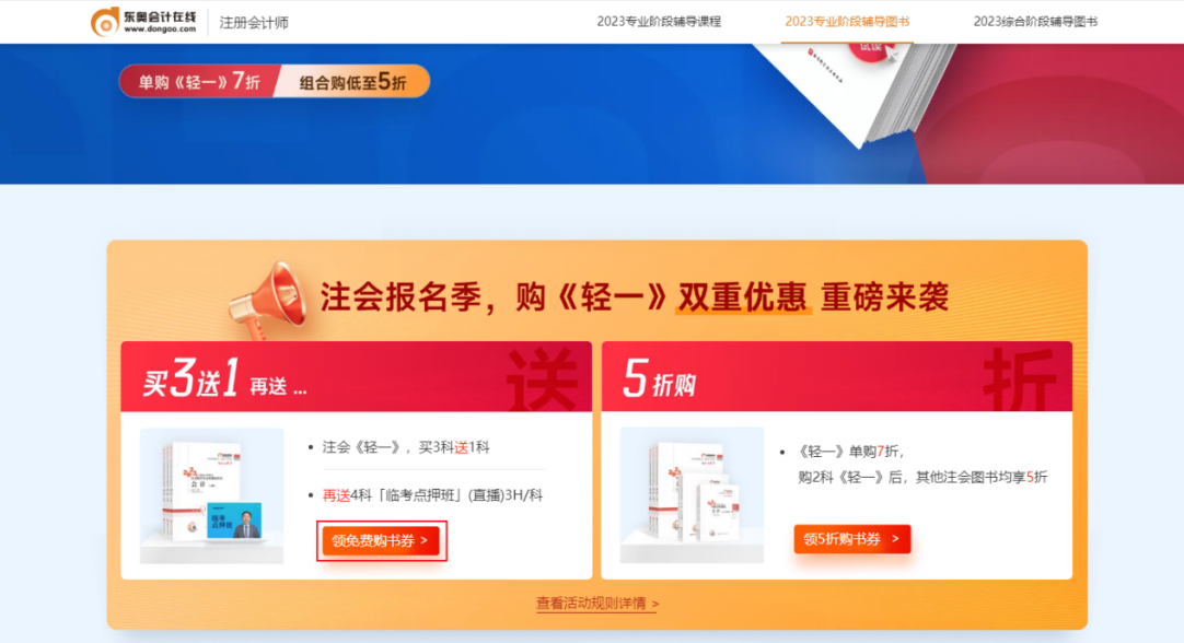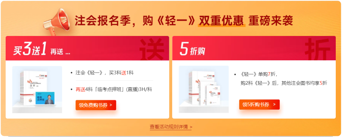在2023年4月6日~4月28日注會(huì)報(bào)名期間,購買兩科或兩科以上的考生,除“7折買《輕一》,享2書2課6資料”的基礎(chǔ)福利外,還可參加“5折購”活動(dòng),以5折價(jià)格購買注會(huì)其他圖書。