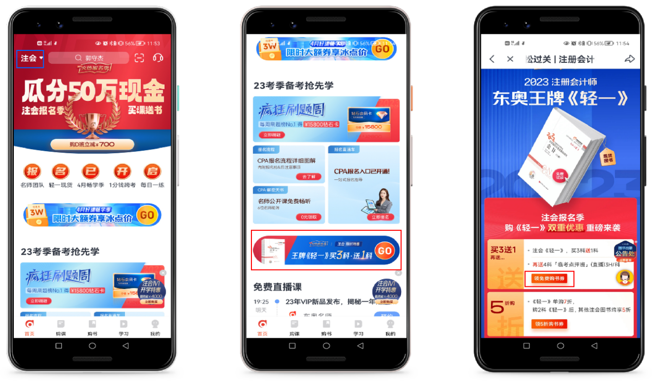 下載“會(huì)計(jì)云課堂”并登錄→切換考種選項(xiàng)為“注會(huì)”→點(diǎn)擊下方“買3贈(zèng)1”活動(dòng)按鈕進(jìn)入活動(dòng)界面→點(diǎn)擊“領(lǐng)免費(fèi)購書卷”。