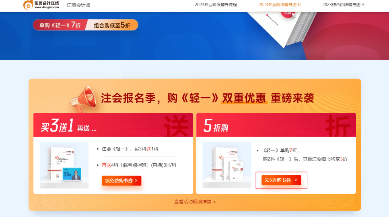 凡購買2023年注會(huì)《輕一》或《輕一》組合,2科及以上的學(xué)員,報(bào)名季期間,再購《注會(huì)》其他圖書(官方教材除外),均享5折優(yōu)惠。